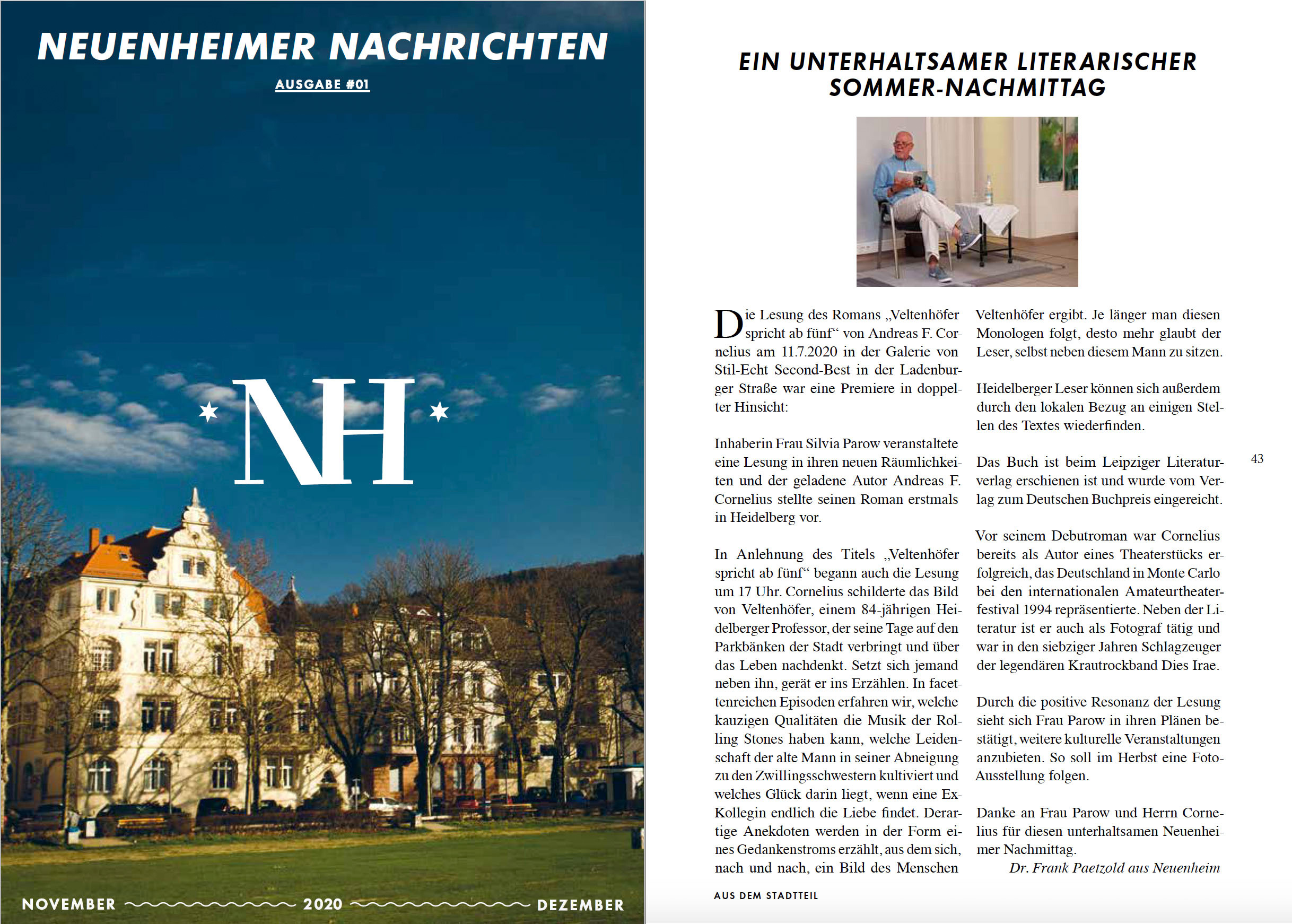 Es ist der 02. Oktober 2009 und früher Nachmittag. Veltenhöfer sitzt auf einer Parkbank nahe der Heidelberger Stadtbücherei. Ein zweiter Mann, wesentlich jünger, gesellt sich dazu. Und somit beginnt très vite sozusagen eine einzigartige Tour ins Leben: pfeilgerade, von Null auf Hundert und gleichwohl illustrativ als auch spekulativ. Des Professors Weitsicht, sein skurriler Humor und seine ingeniösen Denkmodelle sind einzigartig. Und so steigert sich Veltenhöfer schon nach den ersten Sätzen in eine monodialogische Explikation, die nicht aufzuhören scheint und dennoch recht abrupt endet. Veltenhöfer bemerkt etwas, was sonst niemand bemerkt. Und das verwirrt ihn reichlich. Er wird reagieren müssen.